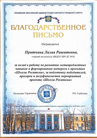 2021 год Благодарственное письмо Управления образования администрации Озерского городского округа