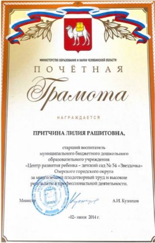2014 год Почетная грамота Министерства образования и науки Челябинской области