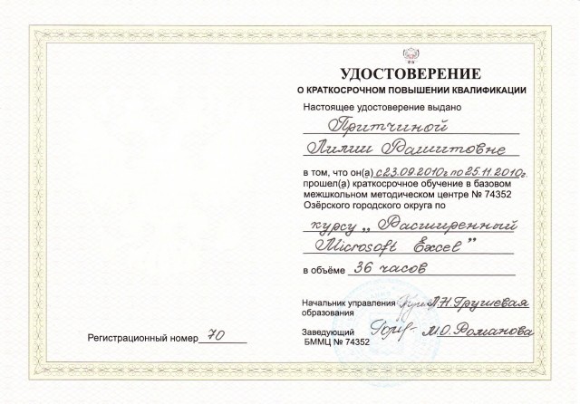 2010 год краткосрочное обучение в базовом межшкольном методическом центре №74352 Озерского городского округа по курсу "Расширенный Microsoft Excel" в объёме 36 часов
