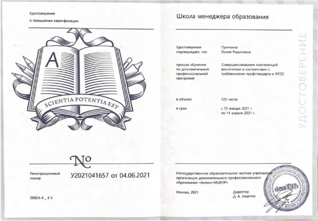 2021 год обучение в Негосударственном образовательном частном учреждении организации дополнительного профессионального образования "Акцион-МЦФЭР" по дополнительной профессиональной программе "Совершенствование компетенций воспитателя в соответствии с требованиями профстандарта и ФГОС" в объеме 120 часов