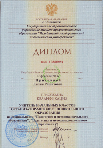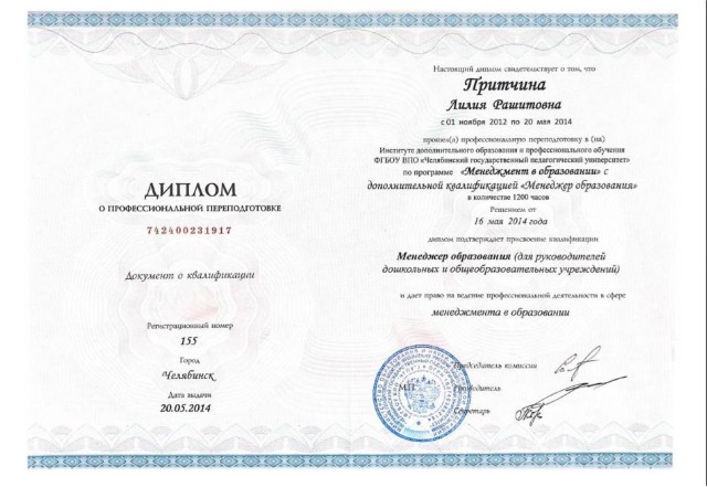 2014 год профессиональная переподготовка в Институте дополнительного образования и профессионального обучения ФГБОУ ВПО "Челябинский государственный педагогический университет" по программе "Менеджмент в образовании" в объеме 1200 часов