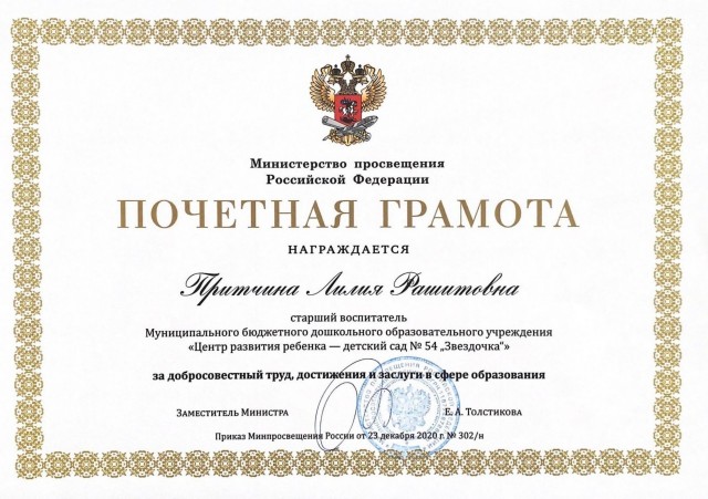 2020 год Почетная грамота Министерства просвещения Российской Федерации