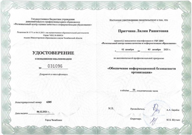 2021 год обучение в Государственном бюджетном учреждении дополнительного профессионального образования "Региональный центр оценки качества и информатизации образования" по дополнительной профессиональной программе "Обеспечение информационной безопасности организации" в объеме 16 часов