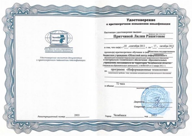 2013 год обучение в Областном государственном бюджетном учреждении "Областной центр информационного и материально-технического обеспечения образовательных учреждений, находящихся на территории Челябинской области" по программе "Информационные технологии" в объеме 72 часа
